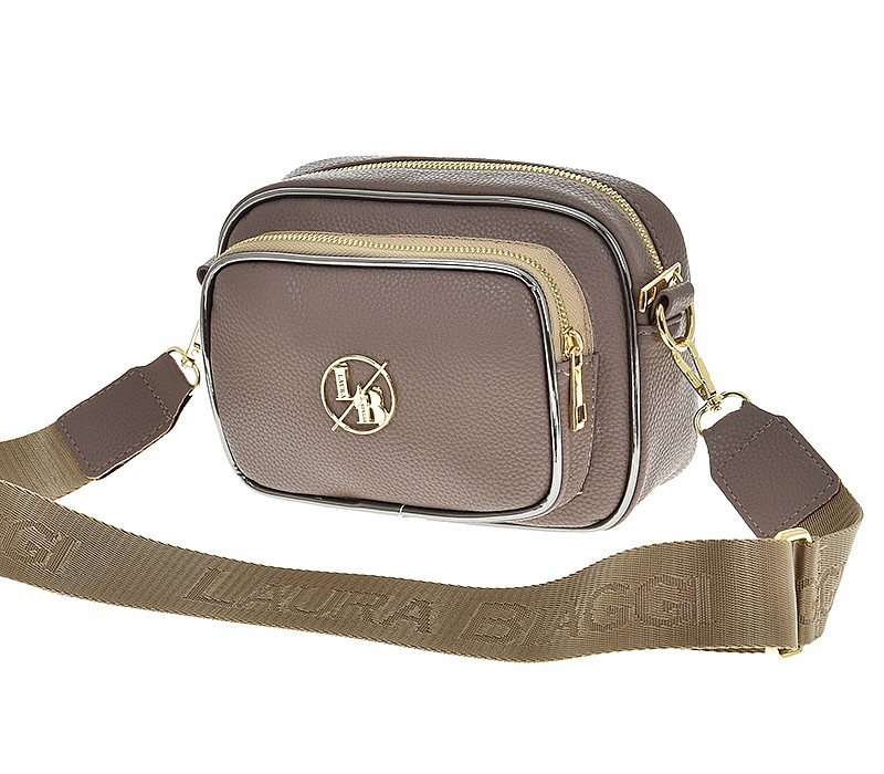 strukturovaná matná eko kůže, metalický lem, zlatý znak, farba mokka